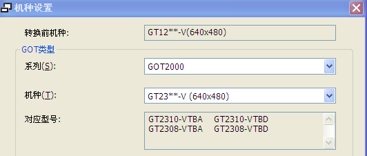 选“转换为got2000数据或gs系列数据后....”,点确定,稍后会出现机种设置窗口: