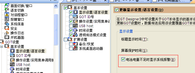转换好后,点软件左边的系统,got设置,显示设置/语言设备,把电池电量不足的勾去掉。