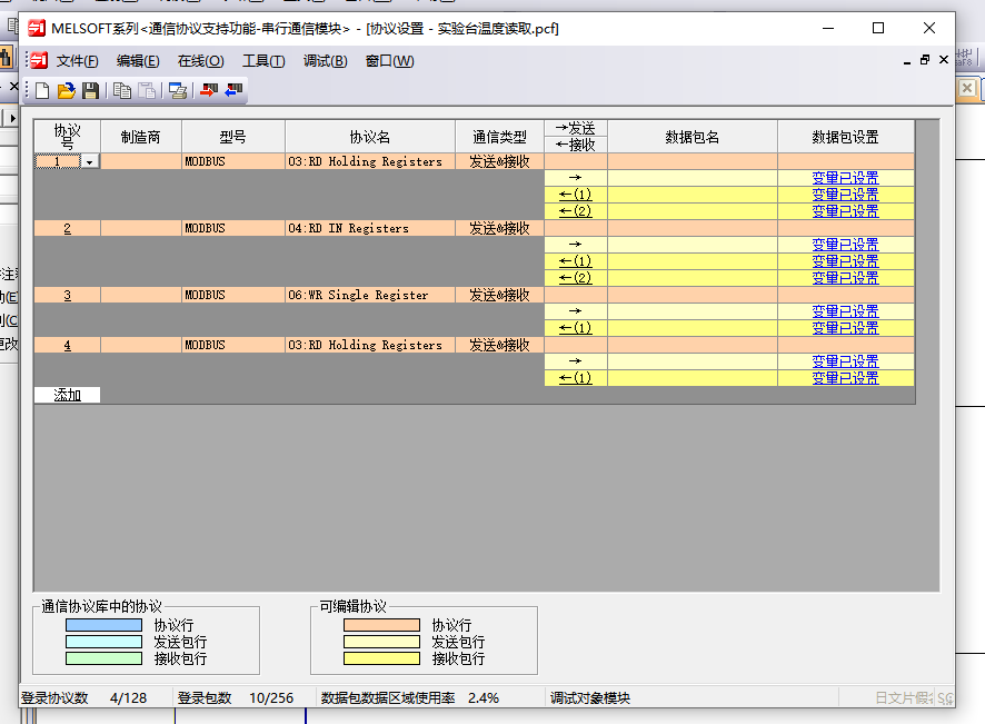 引用引用第3楼zx1234于2024-06-02 19:01发表的 :已经确认过第1个温控仪通讯站号是1,对应的温度显示寄存器是d500,但plc里的d500没找到相关的读取指令d500温控仪1温度显示/d1154温控仪1温度设定d501温控仪2显示/d1155温控仪2设定d502温控仪3显示/d1156温控仪3设定d503温控仪4显示/d1157温控仪4设定.......
