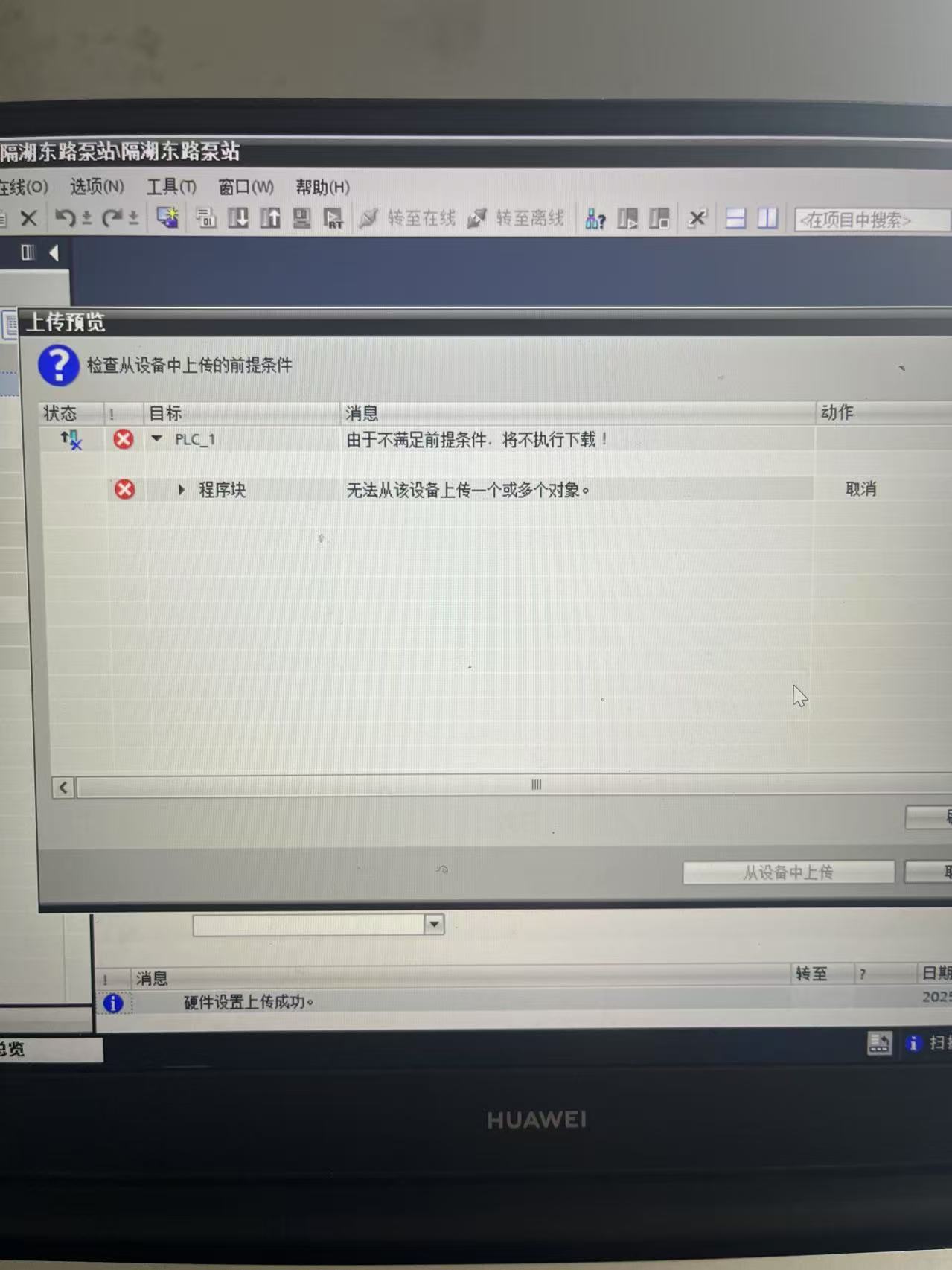 公司有好几台1200的设备在上传程序时会出现 提示 “由于不满足条件将不执行下载” “无法从该设备上传一个或多个对象”。不知是什么问题,想请教该如何解决?问题是手上没有源程序。