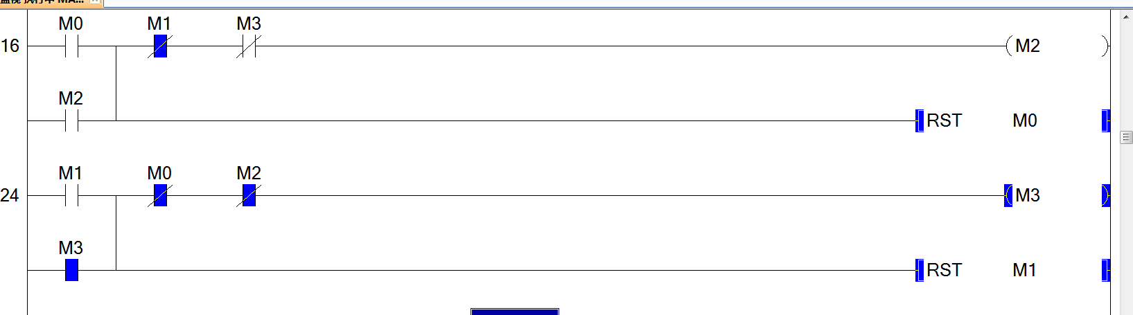 这个正反转直接切换程序,为何不能直接切换,启动m0时按m1可以正常调转,但再按m0时就不能停止m3