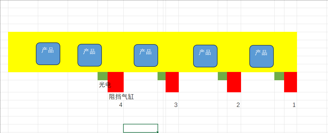 皮带线阻挡气缸控制:黄色是皮带线,绿色是光电感应,红色是阻挡气缸。 怎样控制阻挡1234顺序阻挡。 放行1,然后234补上。