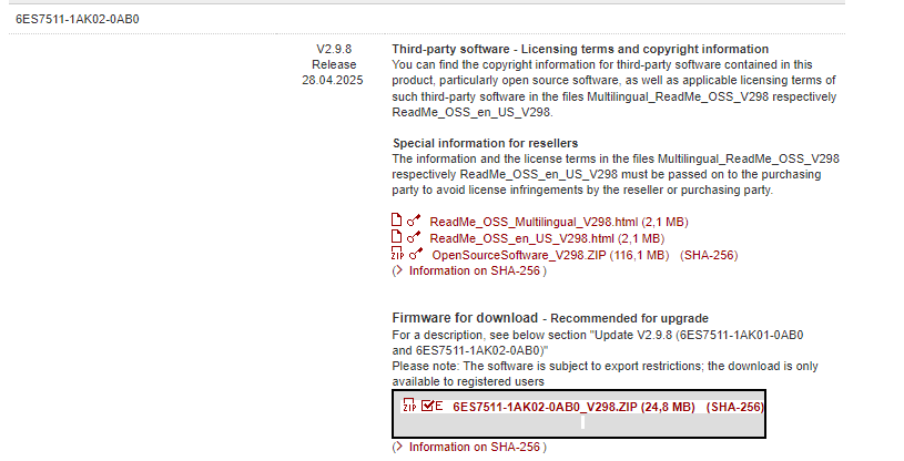 引用引用楼主godwill于2025-08-14 09:15发表的 firmware update for cpu 1511-1 pn 固件升级求助 :各位大神好!客户现场有一台cpu 1511-1 pn,订货号:6es7511-1ak02-0ab0,想升级到固件版本:v2.9.8 release 28.04.2025 ;该固件属于输出受限制软件,注册账号国外审核没有通过,不知道哪位大神有西门子sieportal 授权账号可以帮忙下载一个,感谢大家!谢谢!附西门子固件下载地址: