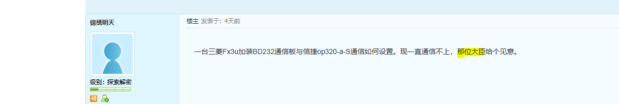 一台三菱fx3u加装bd232通信板与信捷op320-a-s通信如何设置。现一直通信不上,那位大臣给个见意。