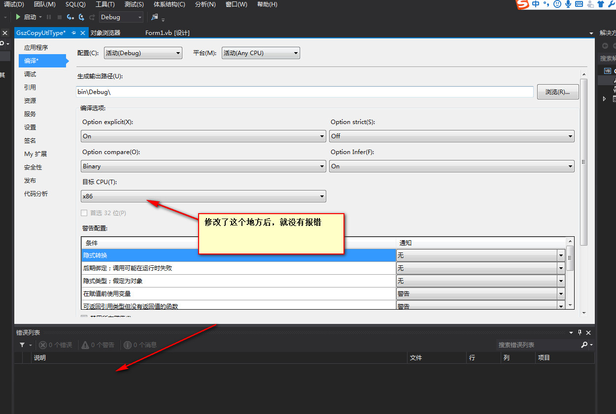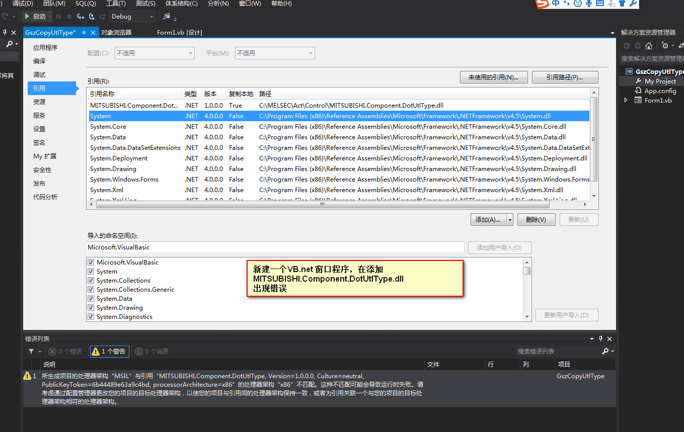 警告 1 所生成项目的处理器架构“msil”与引用“mitsubishi.component.dotutltype, version=1.0.0.0, culture=neutral, publickeytoken=6b44489e63a9c4bd, processorarchitecture=x86”的处理器架构“x86”不匹配。这种不匹配可能会导致运行时失败。请考虑通过配置管理器更改您的项目的目标处理器架构,以使您的项目与引用间的处理器架构保持一致,或者为引用关联一个与您的项目的目标处理器架构相符的处理器架构。 gszcopyutltype