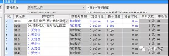 要使用软元件功能,可以在定位表格中最上方选择“使用软元件“,并在第一个表格中填写用户自行设定的起始软元件名称和序号,如下图中的d100,设置后每一行表格将会占用连续的6个软元件。