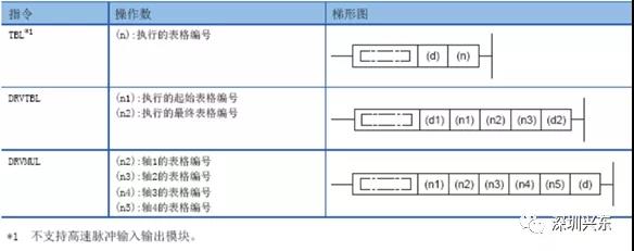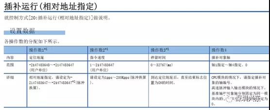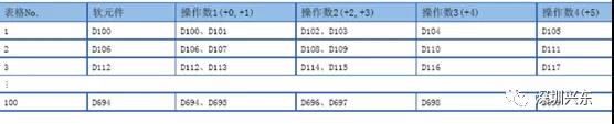 操作数对应到控制方式,后面表格对应的地址如下图:按d100为第一个表格的起始地址,操作数1对应d100 d101为定位地址,操作数2对应d102 d103为指令速度,操作数3对应d104为停留时间,操作数4对应d105为插补的对象轴。