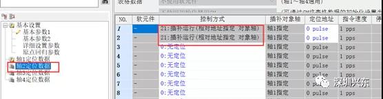 再选择“轴1定位数据”设置具体定位动作,此处可以选择“20插补运行(相对地址定位)”或是“22插补运行(绝对地址定位)”