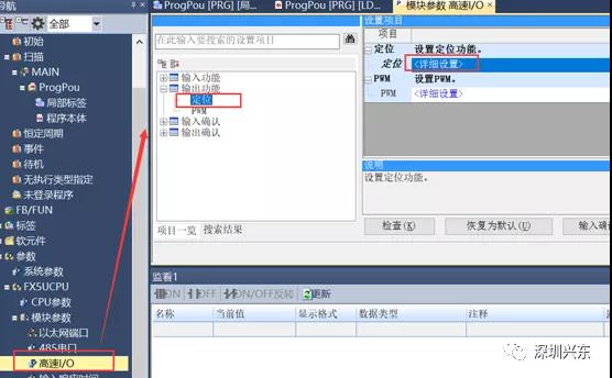打开gx works3编程软件左边树形目录选择:参数——fx5ucpu参数——模块参数——高速i/o,出来对话框中选择:输出功能——定位——详细设置。