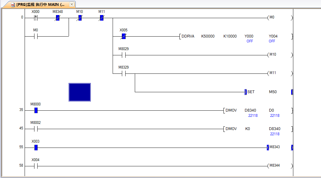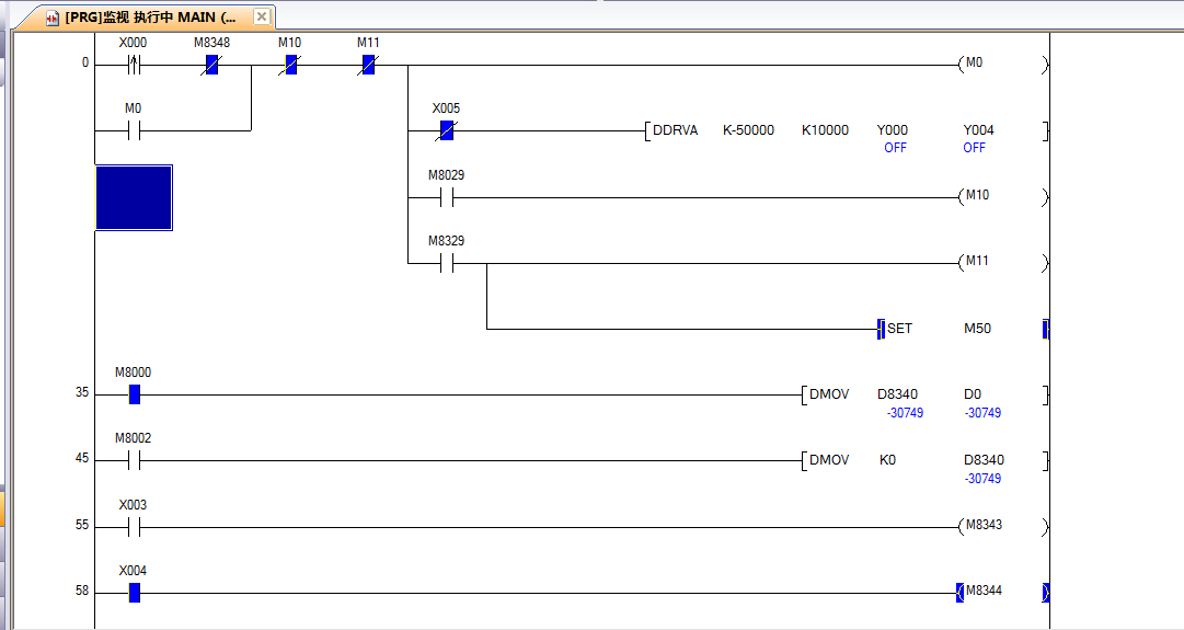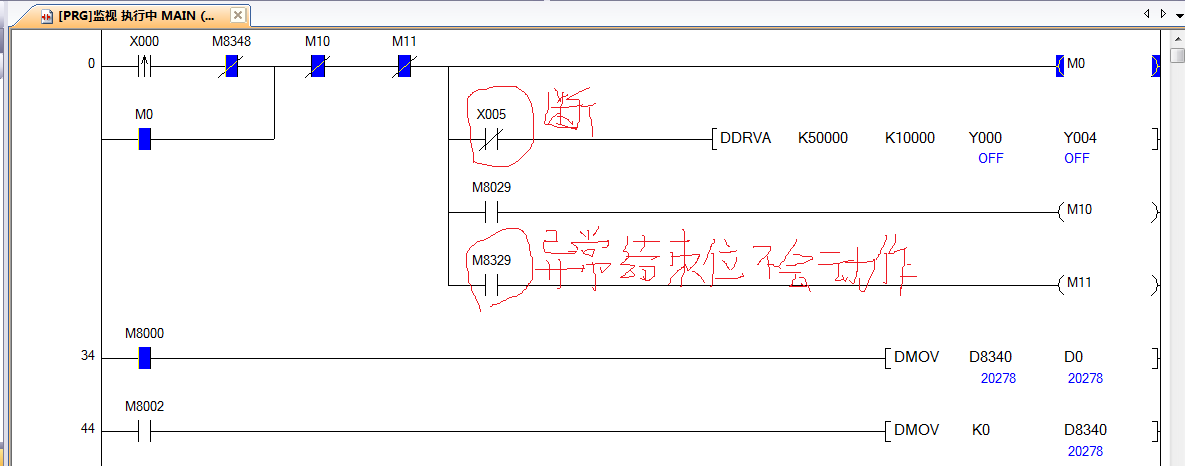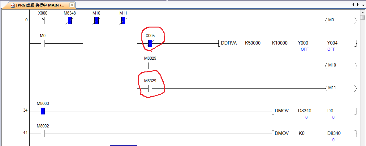 m8329异常结束标志位是zrn/dszn/drvi/drva/dvit指令的,当触发正转极限m8343(y0),反转极限m8344(y0)m8329才至on一个扫描周期,比如用drva指令发5000个脉冲而发脉冲中中途断开驱动条件m8329是不会至on的