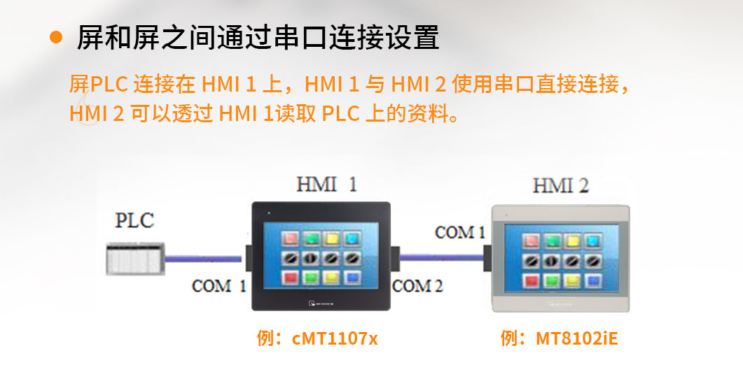 与plc直接相连接hmi1为主屏,从屏hmi2透过串口连接主屏。