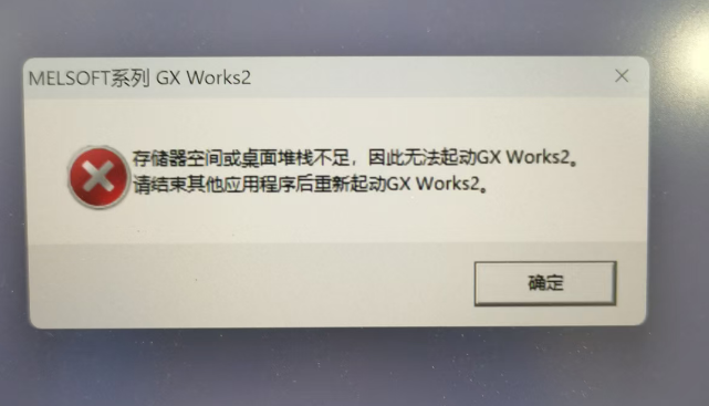 打开程序时显示“系统起动失败,请重新起动windows”对话框,点确定后显示“存储器空间或桌面堆栈不足,因此无法起动gx works2.请结束其它应用程序后重新起动gx works2”.请问这是什么原因呢?谢谢!